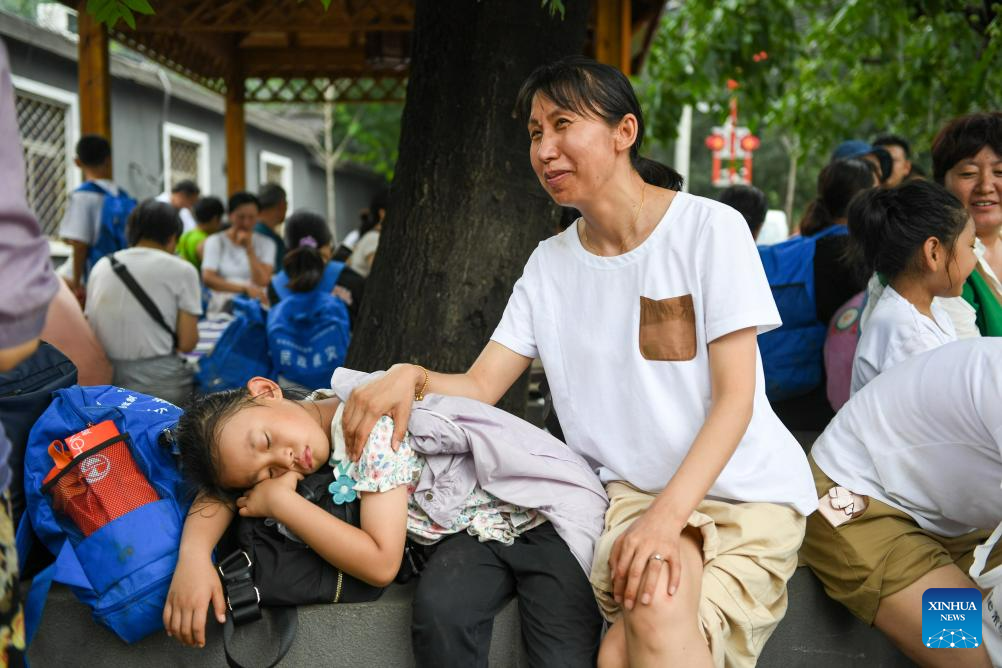 Passengers of Train K396 rest and wait to be transferred in Miaofengshan Town of Mentougou District, Beijing, capital of China, Aug. 2, 2023. Train passengers trapped in Mentougou District due to heavy rainfall have been safely transferred on Wednesday. (Xinhua/Ju Huanzong)