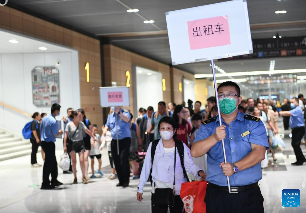 Passengers of Train K396 are led to exit the Beijing Fengtai Railway Station after transfer in Beijing, capital of China, Aug. 2, 2023. Train passengers trapped in Mentougou District due to heavy rainfall have been safely transferred on Wednesday. (Xinhua/Chen Zhonghao)