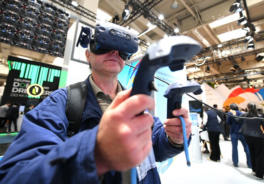 A visitor learns about Haier's industrial internet platform COSMOPlat by VR at Hannover Messe 2023 in Hannover, Germany, April 19, 2023. (Xinhua/Ren Pengfei)