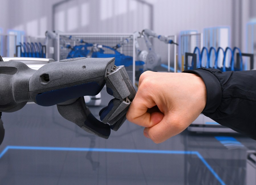 A visitor interacts with an intelligent robot at Hannover Messe 2023 in Hannover, Germany, April 19, 2023.(Xinhua/Ren Pengfei)