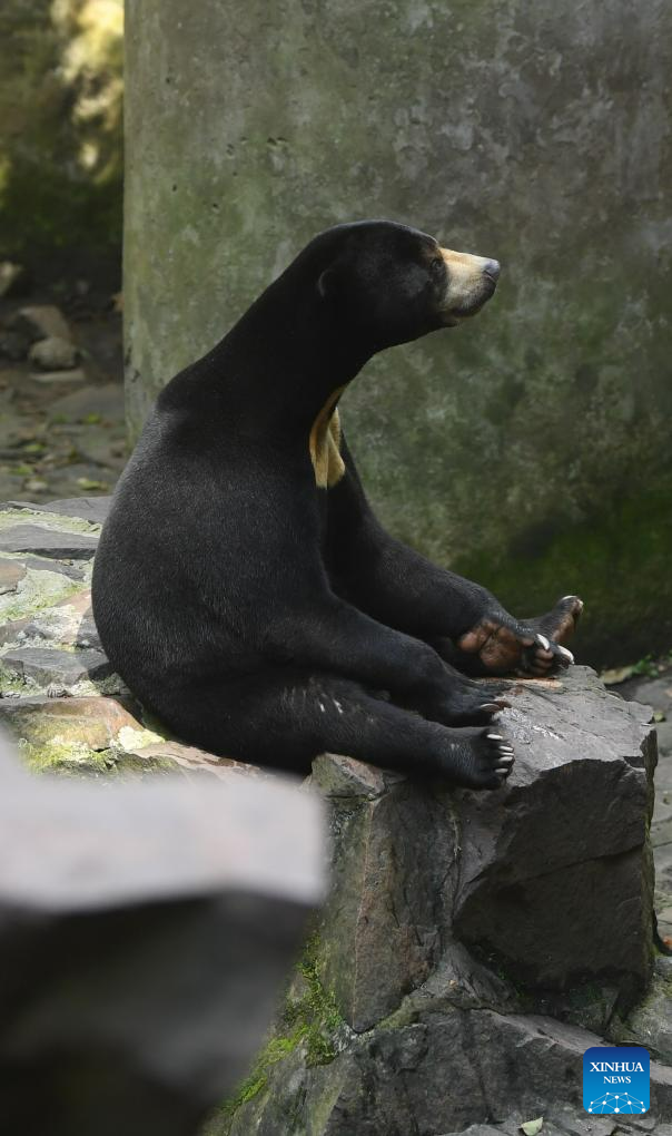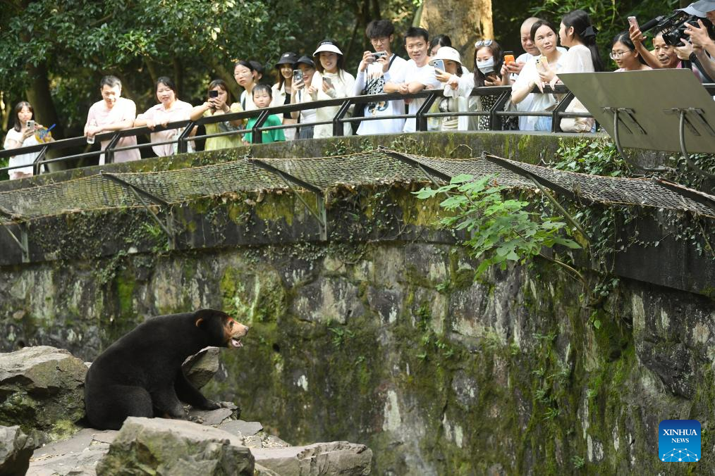A sun bear is seen at Hangzhou Zoo in Hangzhou, east China's Zhejiang Province, Aug. 2, 2023. A video of a four-year-old sun bear standing upright like a human being at Hangzhou Zoo in east China's Zhejiang Province went viral on social media recently, attracting an increased number of tourists coming here to see it. (Xinhua/Weng Xinyang)