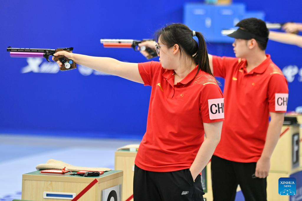Zhang Qi (L)/Hu Kai of China compete during the Shooting 10m Air Pistol Mixed Team Final at the 31st FISU Summer World University Games in Chengdu, southwest China's Sichuan Province, Aug. 2, 2023. (Xinhua/Cao Yiming)