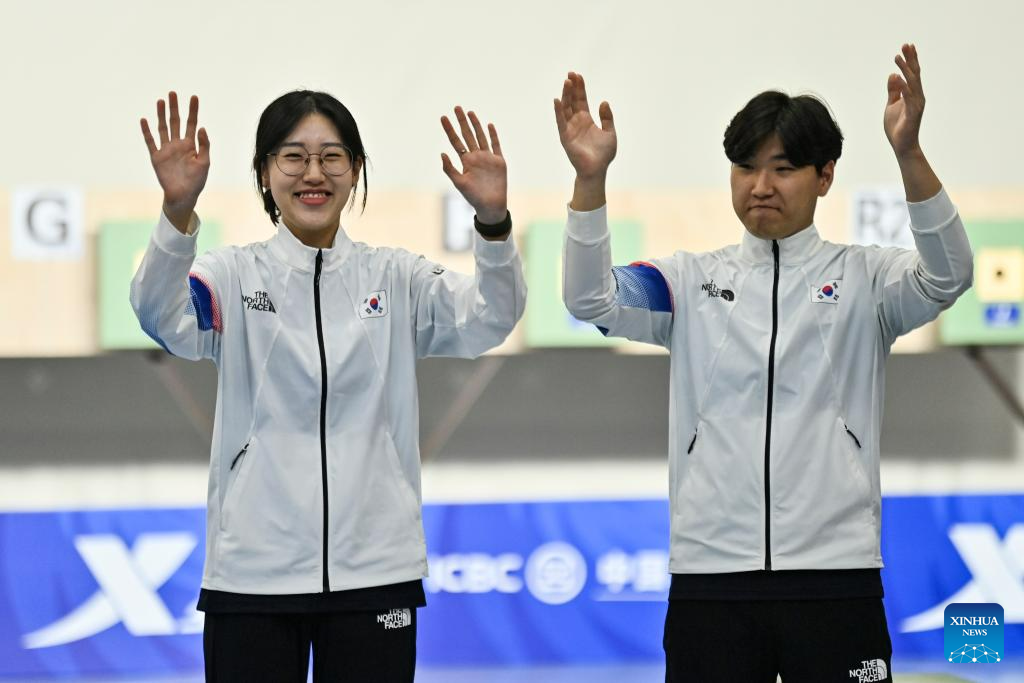 Yang Jiin (L)/Lee Wonho of South Korea react during the awarding ceremony for the Shooting 10m Air Pistol Mixed Team at the 31st FISU Summer World University Games in Chengdu, southwest China's Sichuan Province, Aug. 2, 2023. (Xinhua/Cao Yiming)