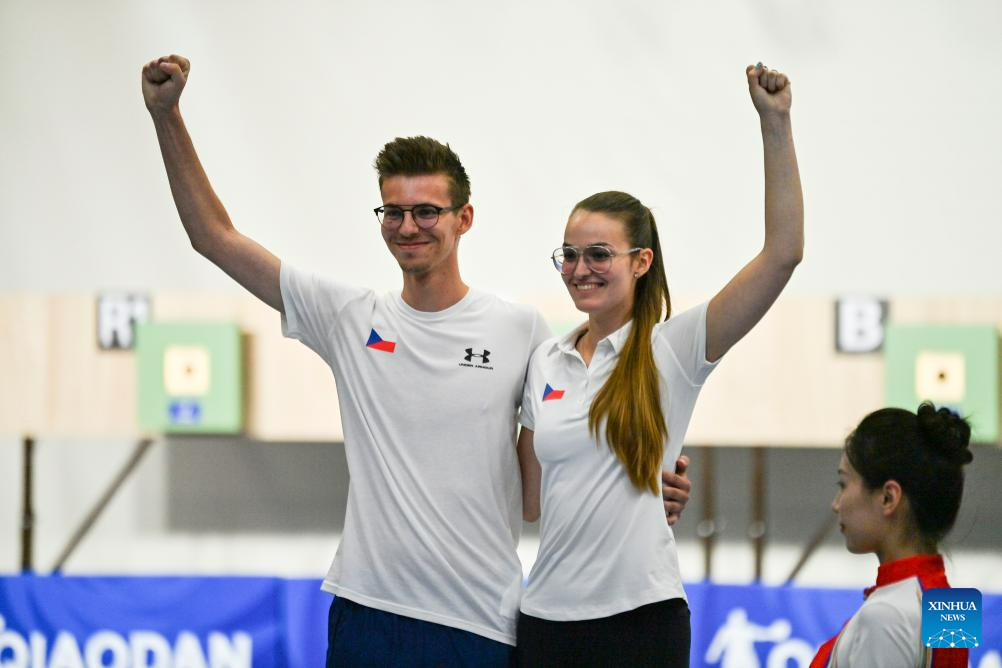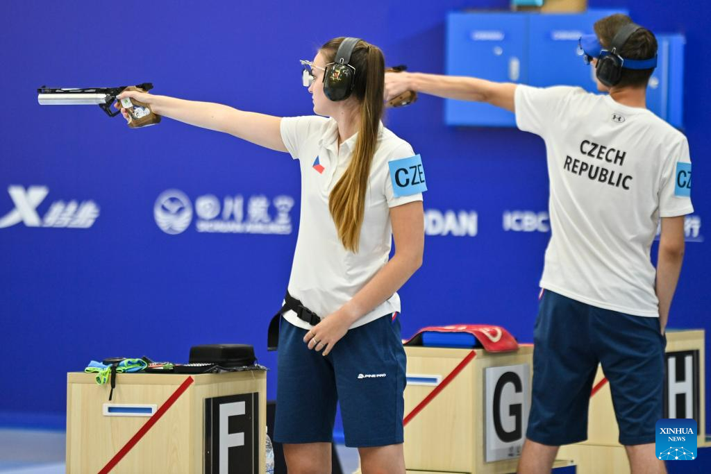 Pavel Schejbal/Veronika Schejbalova (L) of the Czech Republic compete during the Shooting 10m Air Pistol Mixed Team Final at the 31st FISU Summer World University Games in Chengdu, southwest China's Sichuan Province, Aug. 2, 2023. (Xinhua/Cao Yiming)