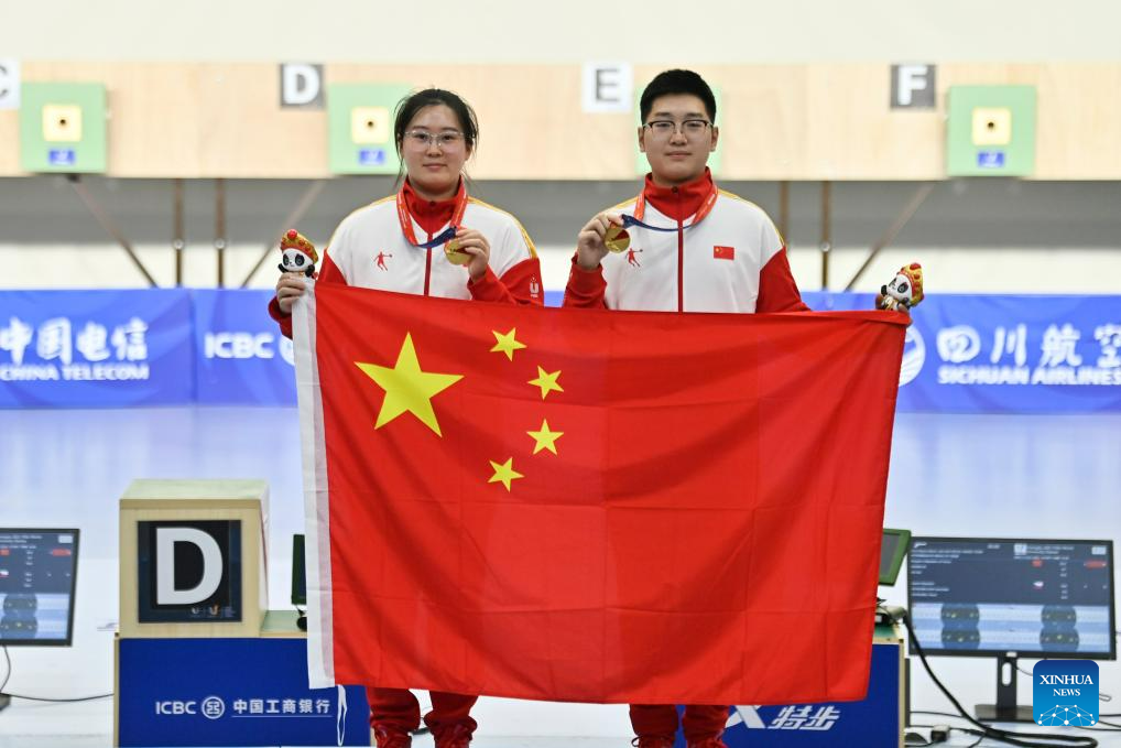 Gold medalists Zhang Qi (L)/Hu Kai of China pose during the awarding ceremony for the Shooting 10m Air Pistol Mixed Team Final at the 31st FISU Summer World University Games in Chengdu, southwest China's Sichuan Province, Aug. 2, 2023. (Xinhua/Cao Yiming)