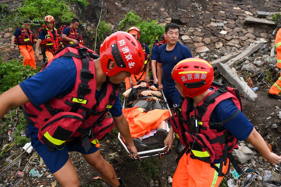 Rescuers transfer an injured villager in Shuiyuzui Village in flood-hit Mentougou District, Beijing, capital of China, Aug. 1, 2023. (Xinhua/Ju Huanzong)