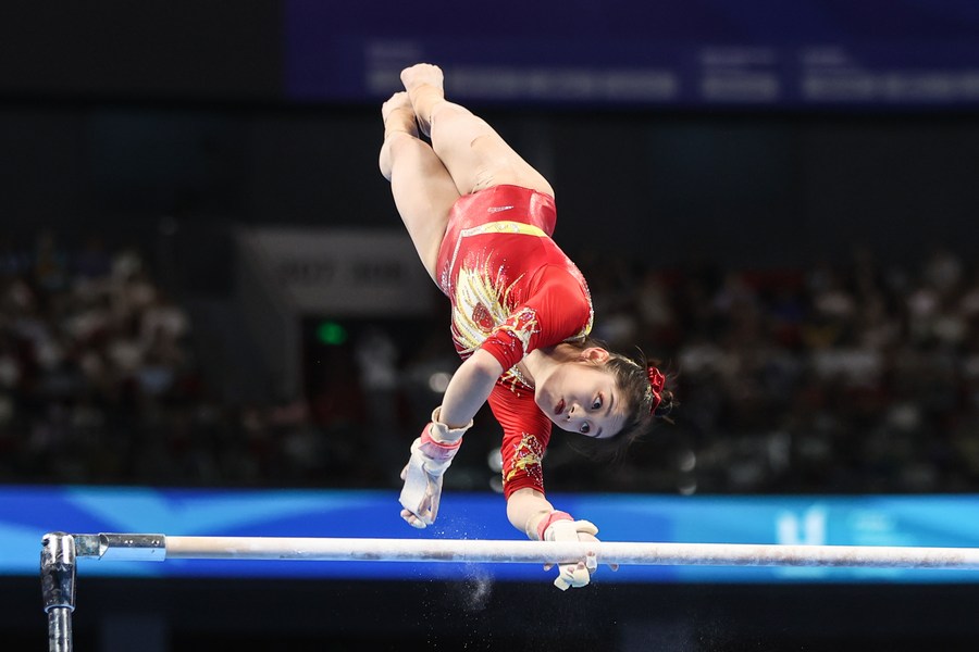Wei Xiaoyuan of China competes in the uneven bars of the artistic gymnastics women's team final at the Chengdu Universiade, August 3, 2023. (Xinhua/Zhang Liyun)