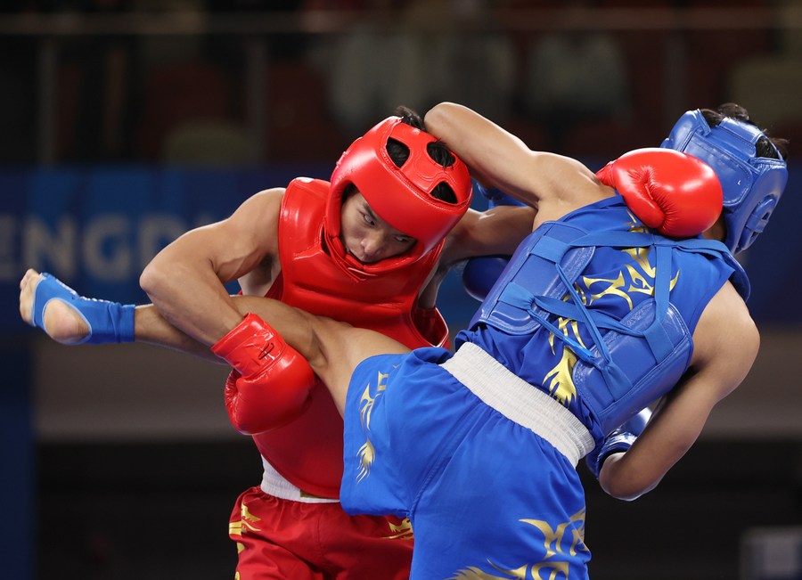 Ma Yigu (in red) of China competes against Nada Guitara of Indonesia in the Sanda men's 60kg final at the Chengdu Universiade, August 3, 2023. (Xinhua/Jia Haocheng)