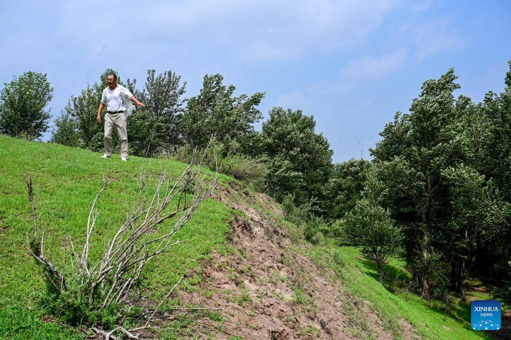 Bai Shun walks on a path to a forest in Bulteger Gacha, Horqin Left Wing Rear Banner of Tongliao City, north China's Inner Mongolia Autonomous Region, Aug. 2, 2023. (Xinhua/Lian Zhen)