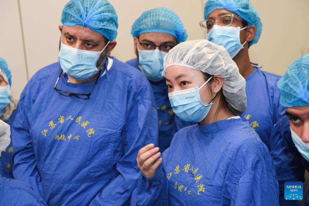 Foreign medical workers of a medical seminar watch as Fan Zhining, expert of digestive endoscopy, performs an operation at digestive endoscopy center of Jiangsu Province Hospital in Nanjing, capital of east China's Jiangsu Province, Aug. 1, 2023. In recent years, Jiangsu Province Hospital cooperated with medical institutions in Pakistan, Egypt and other countries and regions in the field of digestive endoscopy to promote medical cooperation under the Belt and Road Initiative. (Xinhua/Ji Chunpeng)