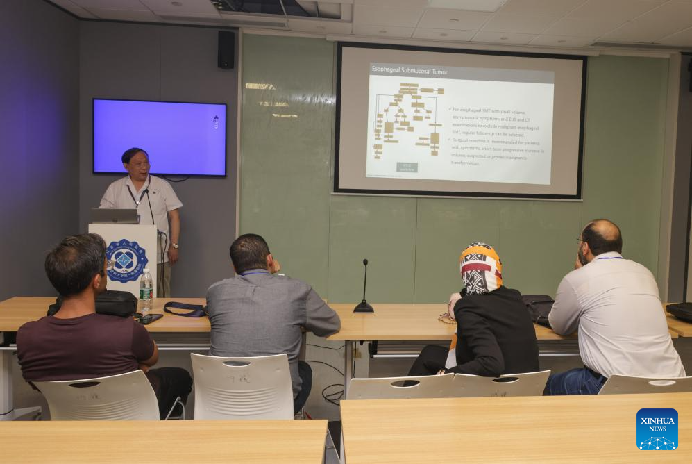 Fan Zhining (back), expert of digestive endoscopy, gives a lecture to foreign medical workers of a medical seminar at Jiangsu Province Hospital in Nanjing, capital of east China's Jiangsu Province, July 25, 2023. In recent years, Jiangsu Province Hospital cooperated with medical institutions in Pakistan, Egypt and other countries and regions in the field of digestive endoscopy to promote medical cooperation under the Belt and Road Initiative. (Photo by Hou Yumeng/Xinhua)