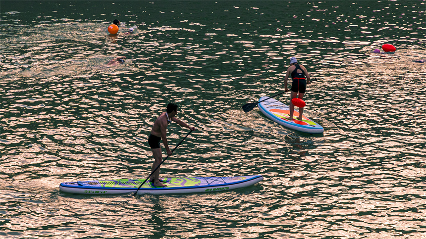 Standup paddle boarding enthusiasts exercise along a riverway in Jianshi county, central China's Hubei Province, on August 1. (Photo/Yu Angang)