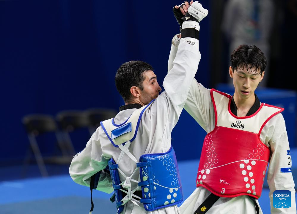 Hakan Recber (L) of Türkiye celebrates defeating Liang Yushuai of China after their taekwondo men's -63kg final at the 31st FISU Summer World University Games in Chengdu, southwest China's Sichuan Province, Aug. 3, 2023. (Xinhua/Jiang Hongjing)