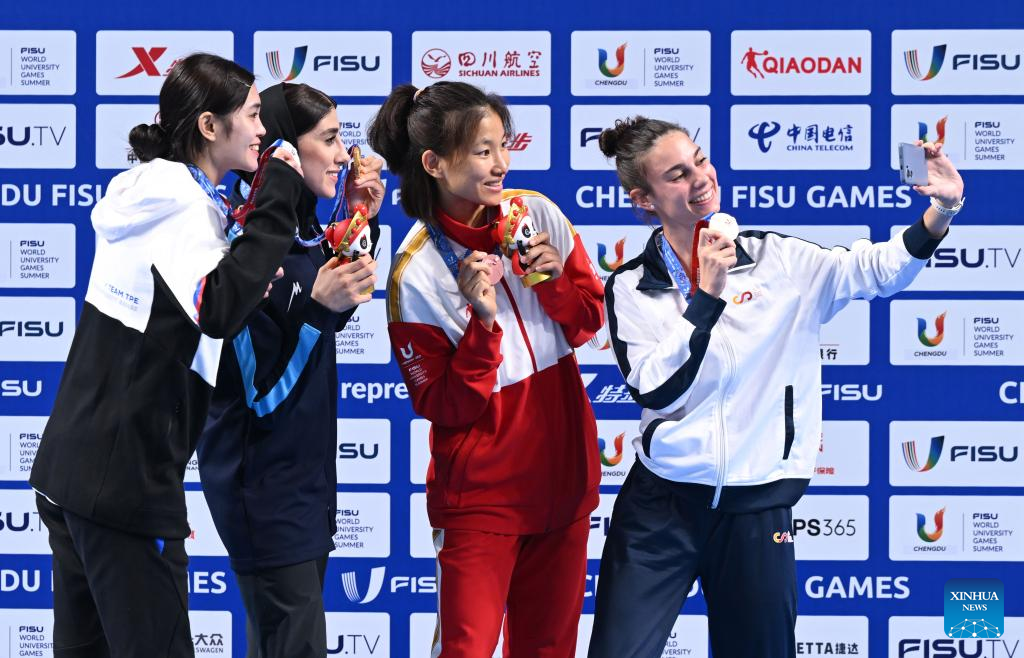 Gold medalist Nahid Kiyanichandeh (2nd L) of Iran, silver medalist Su Po-ya (1st L) of Chinese Taipei, bronze medalists Guo Qing (2nd R) of China and Maria Alma Perez of Spain pose for selfies during the awarding ceremony for taekwondo women's -53kg at the 31st FISU Summer World University Games in Chengdu, southwest China's Sichuan Province, Aug. 3, 2023. (Xinhua/Liu Lei)