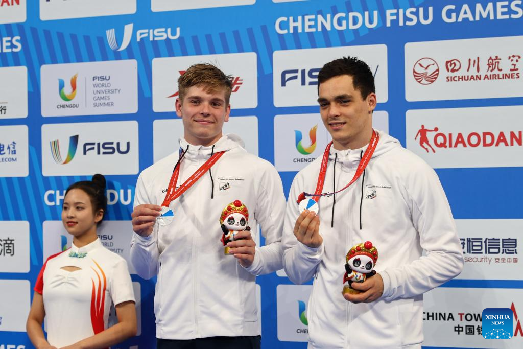 Silver medalists Lou Massenberg (R)/Tom Waldsteiner of Germany pose for photos during the awarding ceremony for the men's synchronised 10m platform of diving at the 31st FISU Summer World University Games in Chengdu, southwest China's Sichuan Province, Aug. 3, 2023. (Xinhua/Wang Xiang)