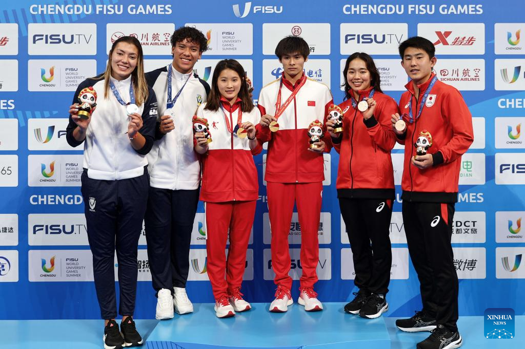Gold medalists Wang Weiying (3rd L)/Yang Ling (3rd R) of China, silver medalists Martins Rodrigues (1st L)/Rafael Silva (2nd L) of Brazil and bronze medalists Kondo Hana (2nd R)/Yamada Shuta of Japan pose for photos during the awarding ceremony for mixed synchronised 3m springboard of diving at the 31st FISU Summer World University Games in Chengdu, southwest China's Sichuan Province, Aug. 3, 2023. (Xinhua/Wang Xiang)