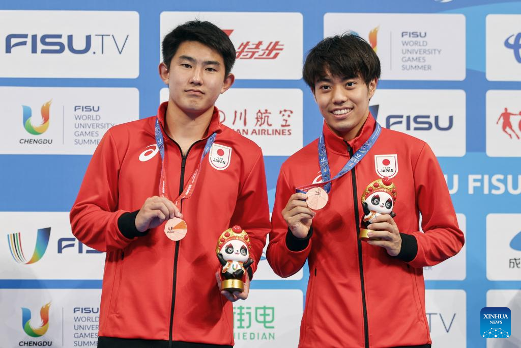 Bronze medalists Nishida Reo (R)/Yamada Shuta of Japan pose for photos during the awarding ceremony for the men's synchronised 10m platform of diving at the 31st FISU Summer World University Games in Chengdu, southwest China's Sichuan Province, Aug. 3, 2023. (Xinhua/Wang Xiang)