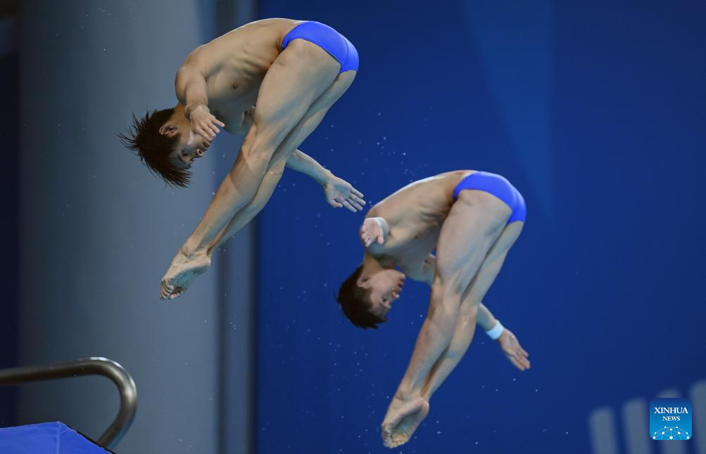Wang Weiying (Rear) and Yang Ling of China compete during the Mixed Synchronised 3m Springboard Final of diving at the 31st FISU Summer World University Games in Chengdu, southwest China's Sichuan Province, Aug. 3, 2023. (Xinhua/Liu Kun)