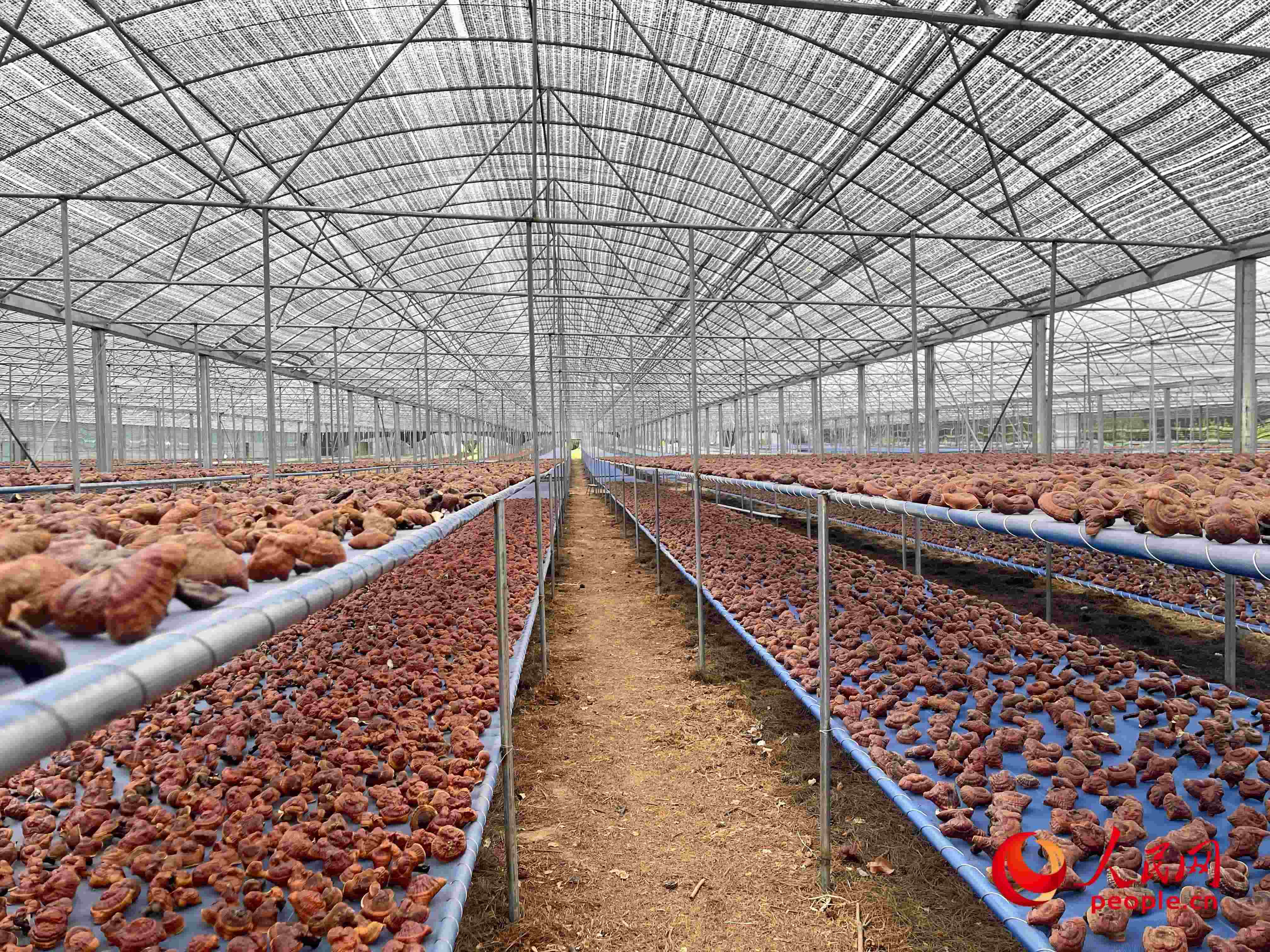 Photo shows Ganoderma leucocontextum, a new variety of fungus species endemic to the Qinghai-Tibet Plateau, in a farm greenhouse in Xueka village, Milin town, Milin county, Nyingchi, southwest China's Tibet Autonomous Region. (People's Daily Online/Zhou Jingyuan)