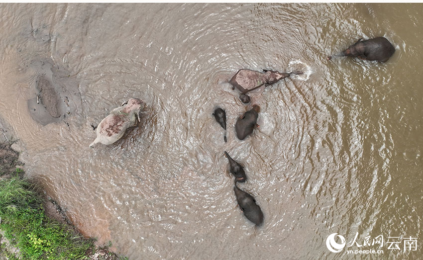 Wild Asian elephants are seen bathing in a river to stay cool in summer in Jiangcheng Hani and Yi autonomous county, Pu'er city, southwest China's Yunnan Province. (Photo/He Yougang)