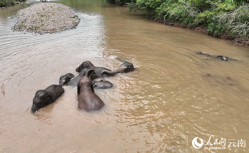 Wild Asian elephants are seen bathing in a river to stay cool in summer in Jiangcheng Hani and Yi autonomous county, Pu'er city, southwest China's Yunnan Province. (Photo/He Yougang)