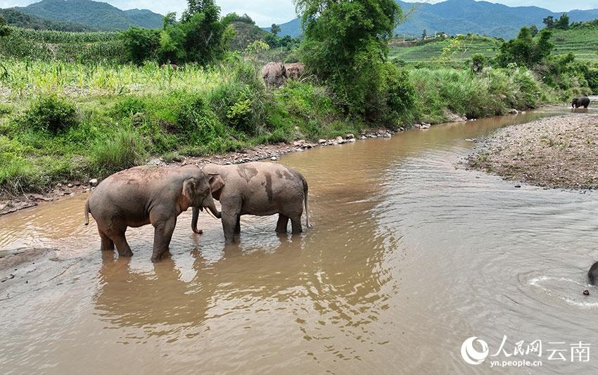 Wild Asian elephants are seen bathing in a river to stay cool in summer in Jiangcheng Hani and Yi autonomous county, Pu'er city, southwest China's Yunnan Province. (Photo/He Yougang)
