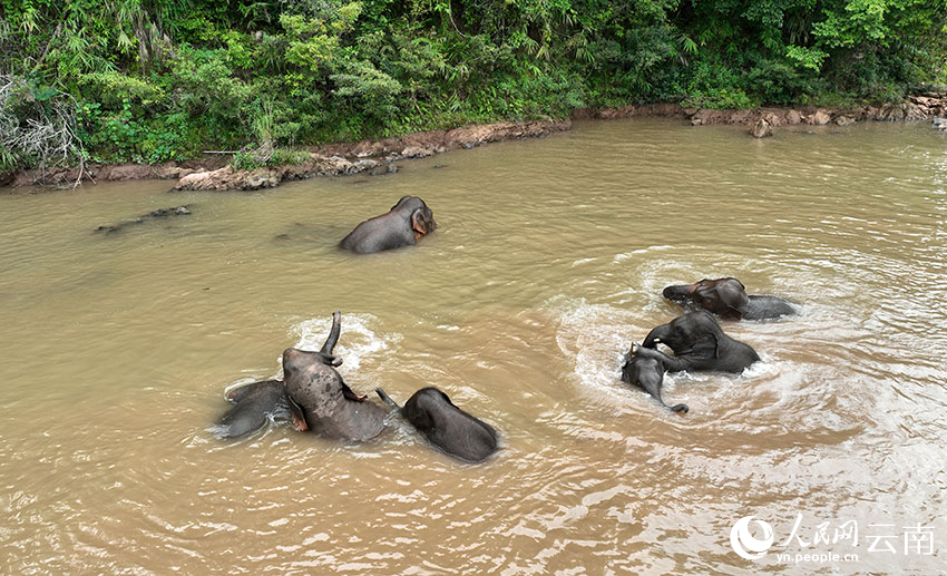 A herd of wild Asian elephants was recently seen taking a bath and playing in a river in Jiangcheng Hani and Yi autonomous county, Pu'er city, southwest China's Yunnan Province.