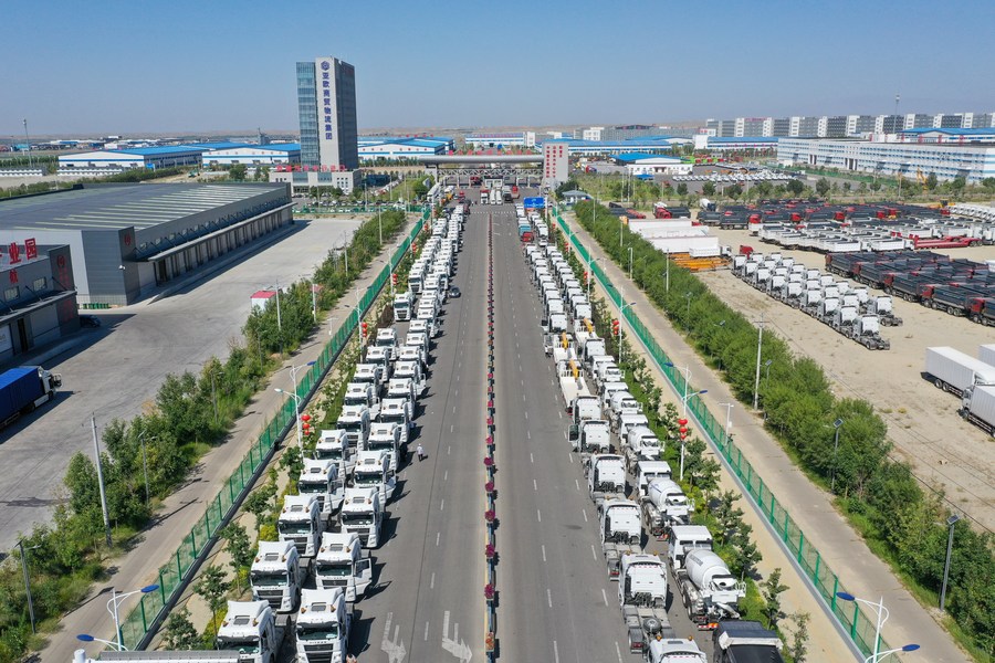 This aerial photo taken on July 26, 2023 shows domestically-made vehicles at the Horgos comprehensive bonded area in northwest China's Xinjiang Uygur Autonomous Region. (Xinhua/Ding Lei)