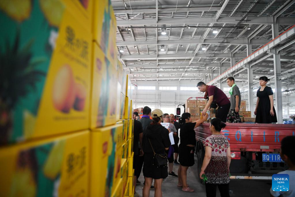 Staff members and volunteers prepare the donated relief supplies for transfer at a storage site of relief supplies in Zhuozhou, north China's Hebei Province, Aug. 5, 2023. A large number of donated relief supplies from all over the country arrived in Zhuozhou on Saturday, supporting local people affected by rainstorms and floods. (Xinhua/Mu Yu)