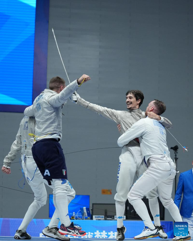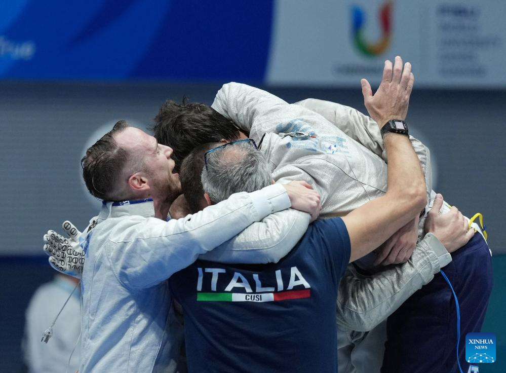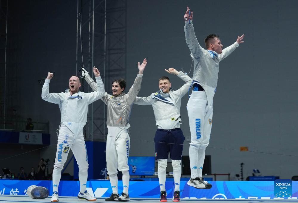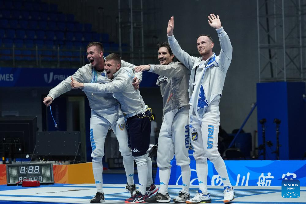 Team Italy celebrate winning the fencing men's sabre team gold medal match against South Korea at the 31st FISU Summer World University Games in Chengdu, southwest China's Sichuan Province, Aug. 5, 2023. (Xinhua/Luo Xuefeng)