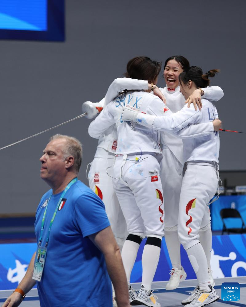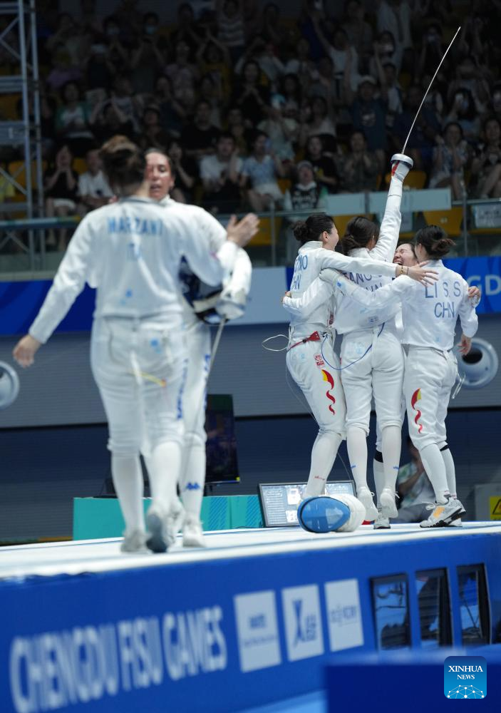 Team China (R) celebrate winning the fencing women's epee team gold medal match against team Italy at the 31st FISU Summer World University Games in Chengdu, southwest China's Sichuan Province, Aug. 5, 2023. (Xinhua/Luo Xuefeng)