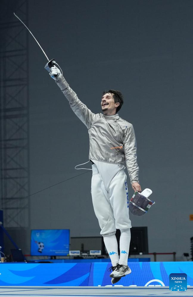 Dario Cavaliere of team Italy celebrates winning the fencing men's sabre team gold medal match against South Korea at the 31st FISU Summer World University Games in Chengdu, southwest China's Sichuan Province, Aug. 5, 2023. (Xinhua/Luo Xuefeng)