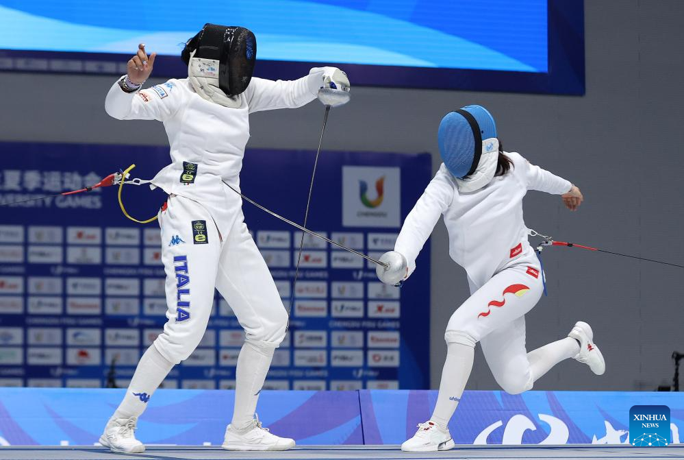 China's Tang Junyao (R) competes against Italy's Gaia Traditi during the fencing women's epee team gold medal match at the 31st FISU Summer World University Games in Chengdu, southwest China's Sichuan Province, Aug. 5, 2023. (Xinhua/Qi Xiaoyi)