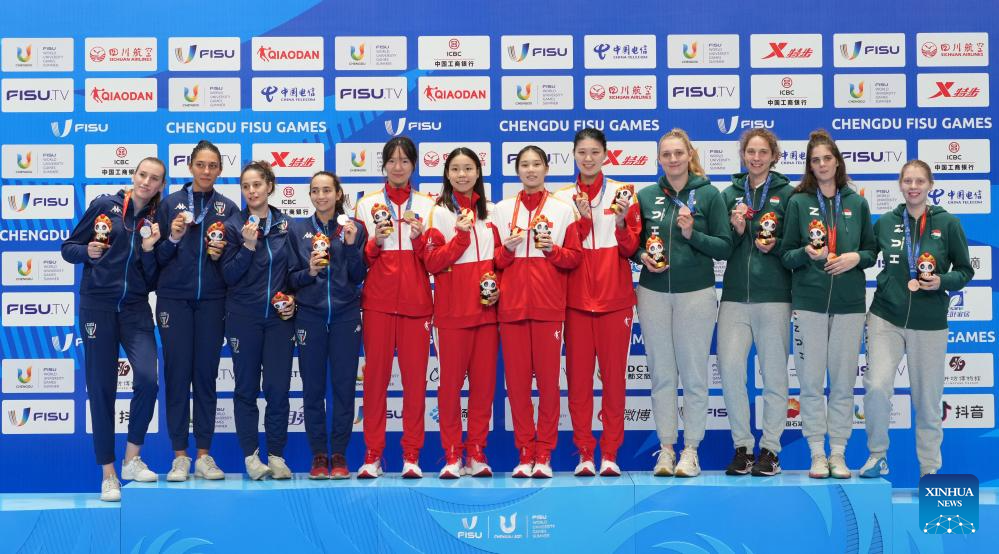 Gold medalists Team China (C), silver medalists Team Italy (L) and bronze mdalists Team Hungary pose on the podium during the awarding ceremony for the fencing women's epee team at the 31st FISU Summer World University Games in Chengdu, southwest China's Sichuan Province, Aug. 5, 2023. (Xinhua/Li Xin)