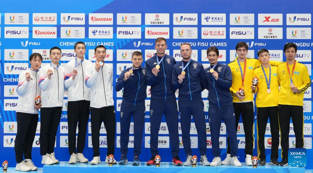 Gold medalists Team Italy (C), silver medalist Team South Korea (L) and bronze medalists Team Kazakhstan pose on the podium during the awarding ceremony for the fencing men's sabre team at the 31st FISU Summer World University Games in Chengdu, southwest China's Sichuan Province, Aug. 5, 2023. (Xinhua/Li Xin)