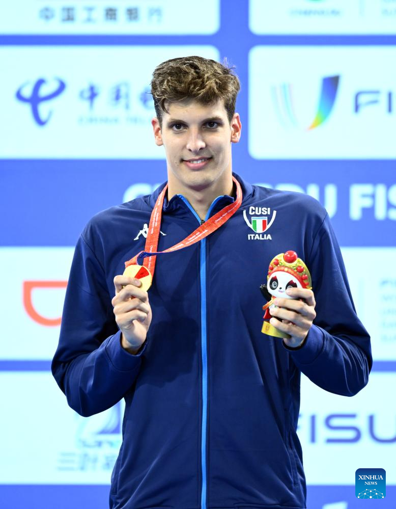 Gold medalist Matteo Lamberti of Italy poses during the awarding ceremony for the swimming men's 800m freestyle at the 31st FISU Summer World University Games in Chengdu, southwest China's Sichuan Province, Aug. 5, 2023. (Xinhua/Wu Gang)