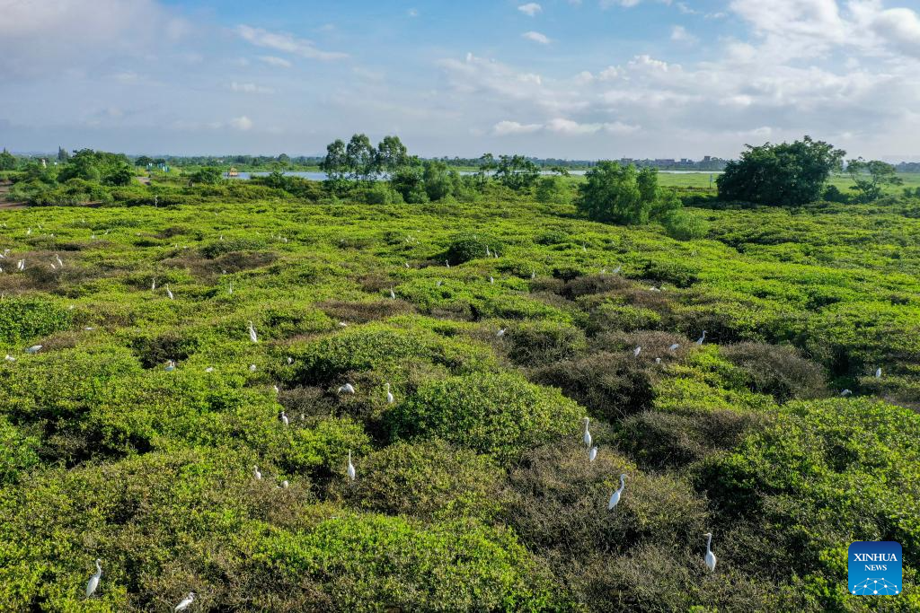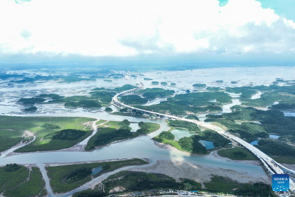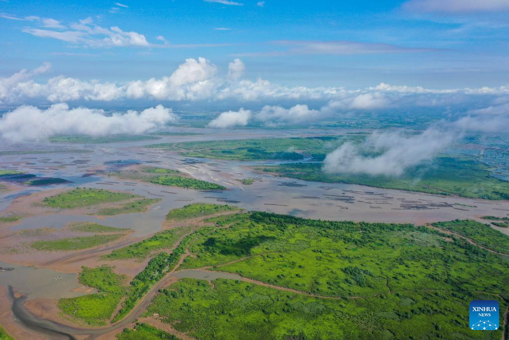 This aerial photo taken on July 23, 2023 shows a mangrove nature reserve in Qinzhou, south China's Guangxi Zhuang Autonomous Region. Qinzhou is a node of the New International Land-Sea Trade Corridor connecting Guangxi and ASEAN countries, and its location is highly beneficial, granting the city an important role in international land-sea transport connectivity. (Xinhua/Cao Yiming)