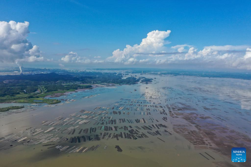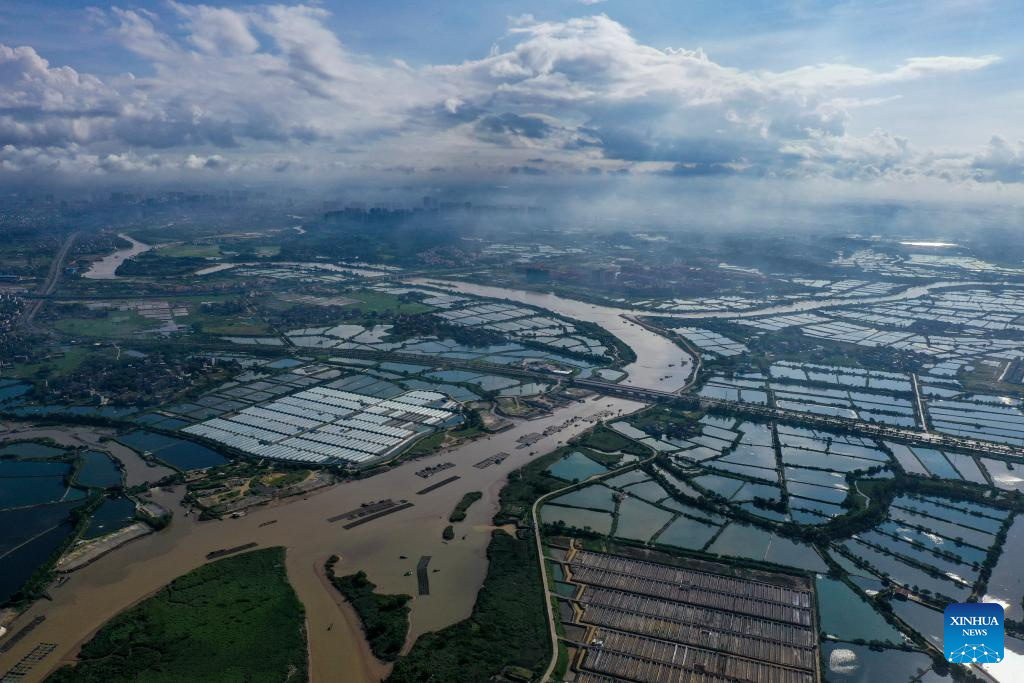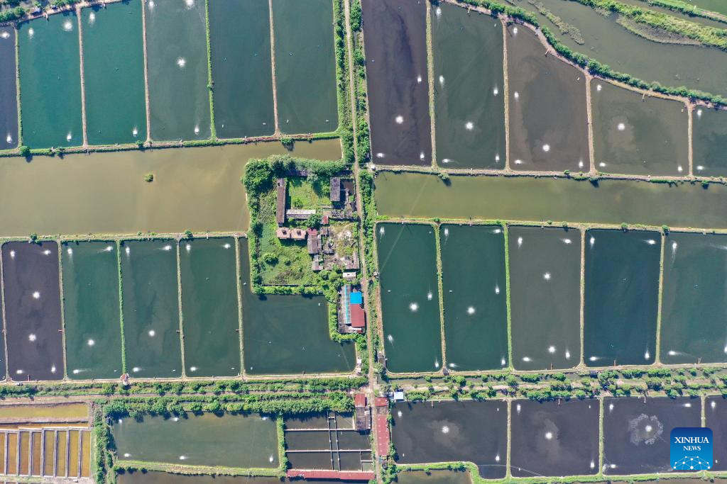 This aerial photo taken on July 23, 2023 shows an aquaculture farm in Qinzhou, south China's Guangxi Zhuang Autonomous Region. Qinzhou is a node of the New International Land-Sea Trade Corridor connecting Guangxi and ASEAN countries, and its location is highly beneficial, granting the city an important role in international land-sea transport connectivity. (Xinhua/Cao Yiming)