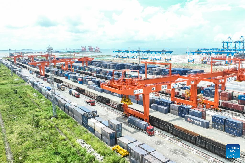 This aerial photo taken on July 22, 2023 shows a railway container terminal in Qinzhou, south China's Guangxi Zhuang Autonomous Region. Qinzhou is a node of the New International Land-Sea Trade Corridor connecting Guangxi and ASEAN countries, and its location is highly beneficial, granting the city an important role in international land-sea transport connectivity. (Xinhua/Cao Yiming)