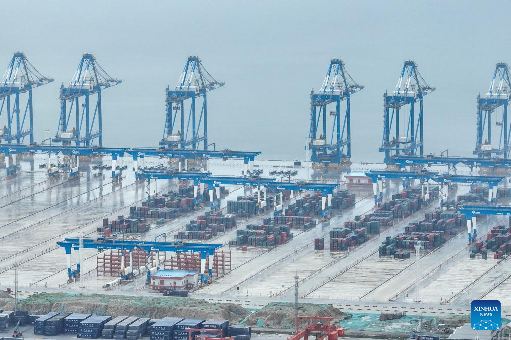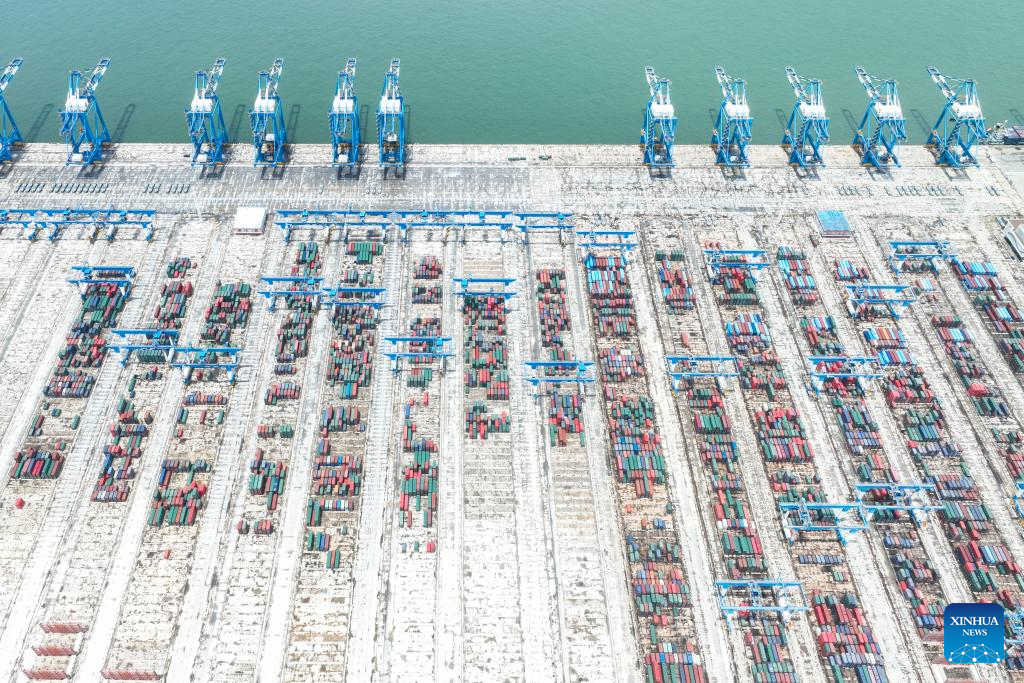 This aerial photo taken on July 22, 2023 shows a container wharf of the Beibu Gulf Port in Qinzhou, south China's Guangxi Zhuang Autonomous Region. Qinzhou is a node of the New International Land-Sea Trade Corridor connecting Guangxi and ASEAN countries, and its location is highly beneficial, granting the city an important role in international land-sea transport connectivity. (Xinhua/Cao Yiming)