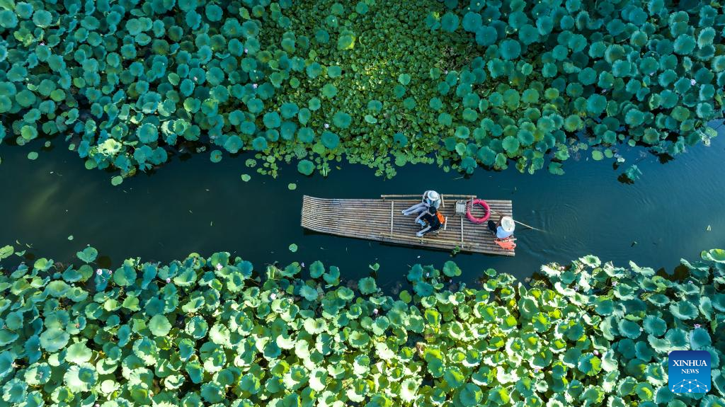 This aerial photo taken on Aug. 4, 2023 shows tourists riding a bamboo raft at Chengkan ancient village in Huangshan City, east China's Anhui Province. The ancient villages in Huangshan City witnessed a travel peak in summer. (Photo by Fan Chengzhu/Xinhua)