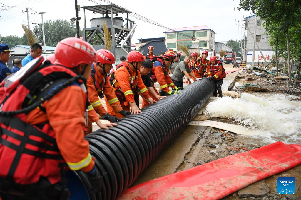 Rescuers carry out drainage operation in Diaowo Township, Zhuozhou, north China's Hebei Province, Aug. 6, 2023. With flood water subsiding, local residents, volunteers and rescuers in Zhuozhou are carrying out cleaning-up, disinfection, and drainage operations to bring losses down to the minimum level. (Xinhua/Mu Yu)