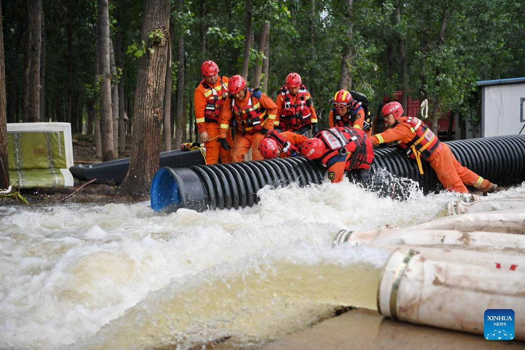 Drainage facilities in operation are pictured in Diaowo Township, Zhuozhou, north China's Hebei Province, Aug. 6, 2023. With flood water subsiding, local residents, volunteers and rescuers in Zhuozhou are carrying out cleaning-up, disinfection, and drainage operations to bring losses down to the minimum level. (Xinhua/Mu Yu)