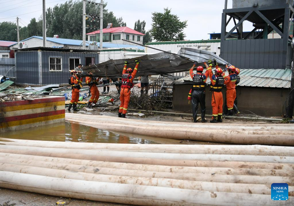 Rescuers remove debris in Diaowo Township, Zhuozhou, north China's Hebei Province, Aug. 6, 2023. With flood water subsiding, local residents, volunteers and rescuers in Zhuozhou are carrying out cleaning-up, disinfection, and drainage operations to bring losses down to the minimum level. (Xinhua/Mu Yu)