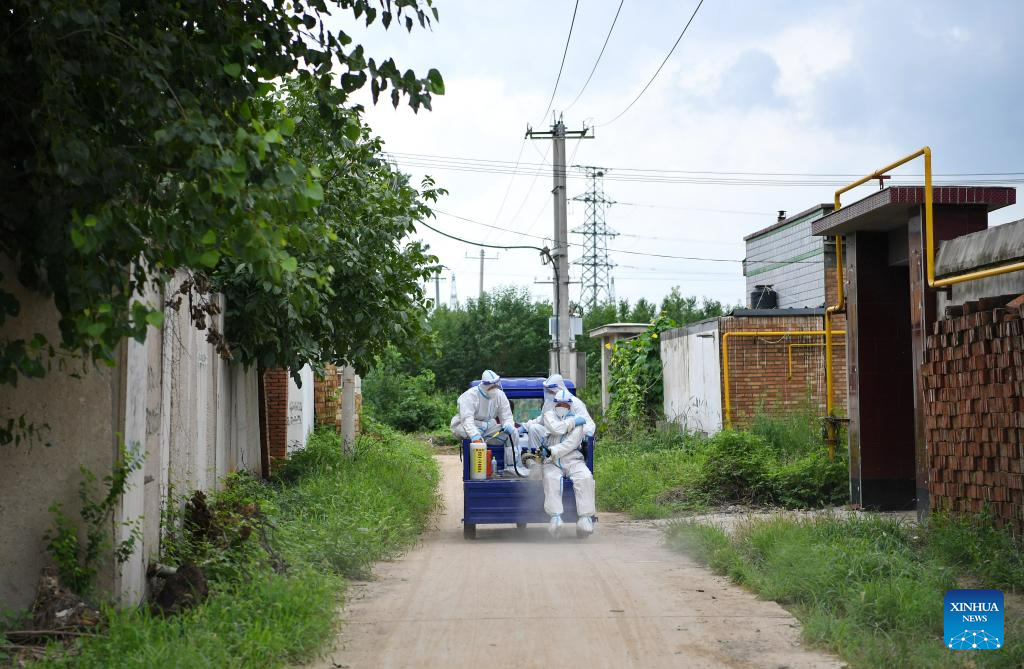 Volunteers perform outdoor disinfection in Diaowo Township, Zhuozhou, north China's Hebei Province, Aug. 6, 2023. With flood water subsiding, local residents, volunteers and rescuers in Zhuozhou are carrying out cleaning-up, disinfection, and drainage operations to bring losses down to the minimum level. (Xinhua/Mu Yu)