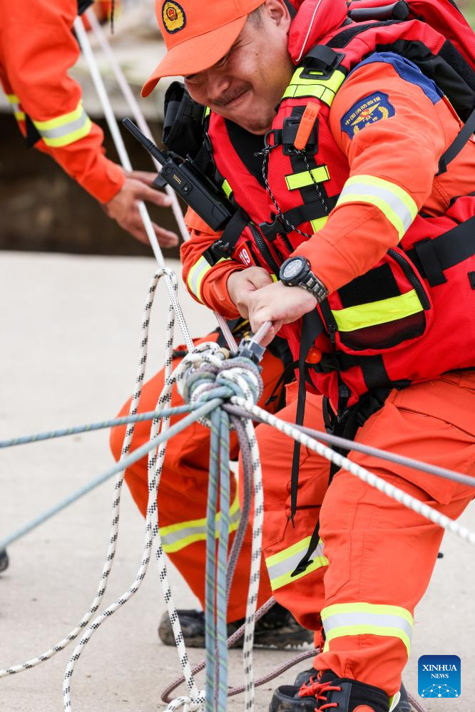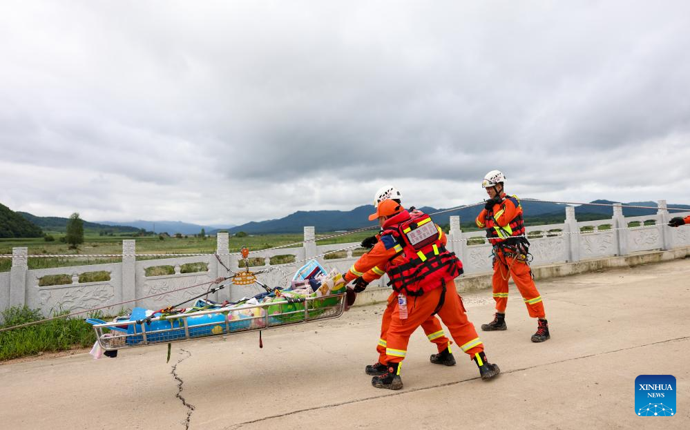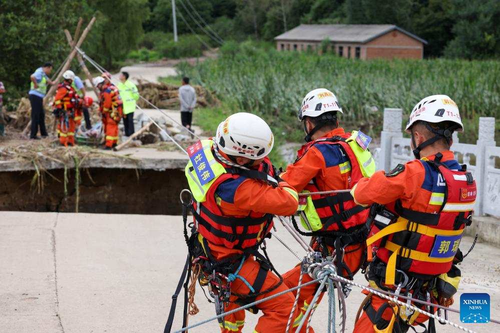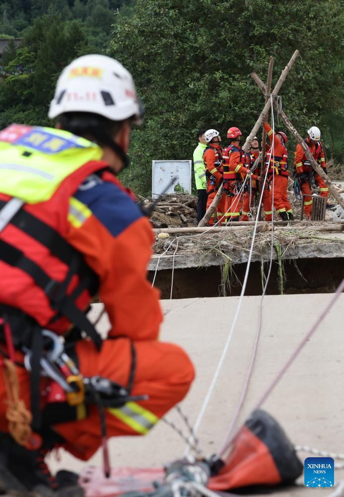 Rescuers set up a rope rescue system on the collapsed bridge in Kaiyuan Town of Shulan City, northeast China's Jilin Province, Aug. 6, 2023. (Xinhua/Yan Linyun)