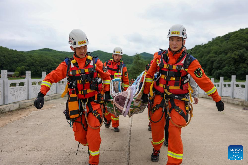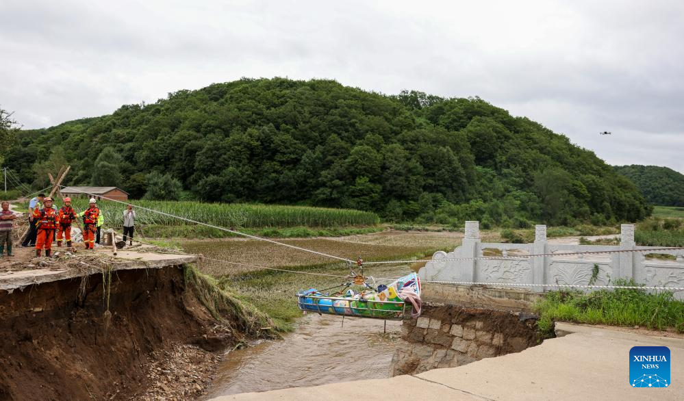 Rescuers transfer a trapped villager via a rope rescue system in Kaiyuan Town of Shulan City, northeast China's Jilin Province, Aug. 6, 2023. (Xinhua/Yan Linyun)