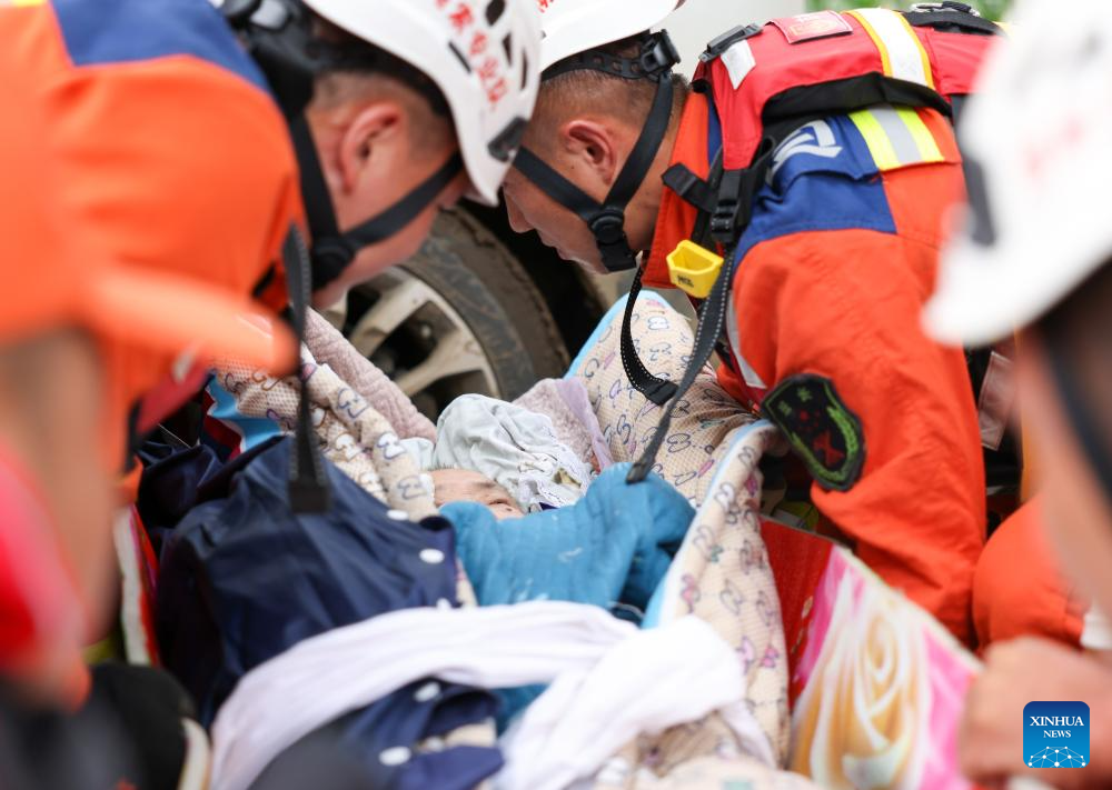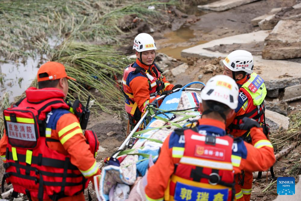 Rescuers carry a trapped villager in Kaiyuan Town of Shulan City, northeast China's Jilin Province, Aug. 6, 2023. (Xinhua/Yan Linyun)