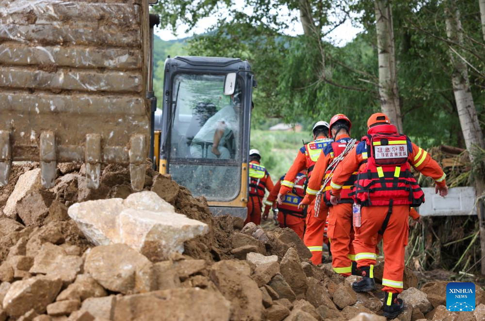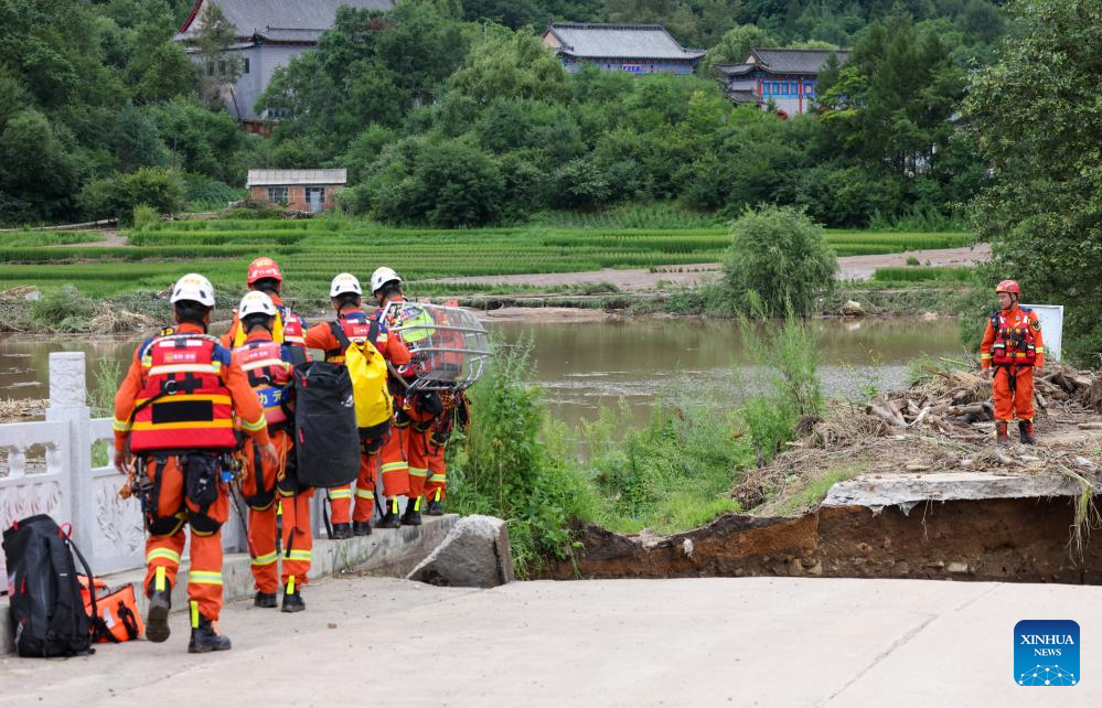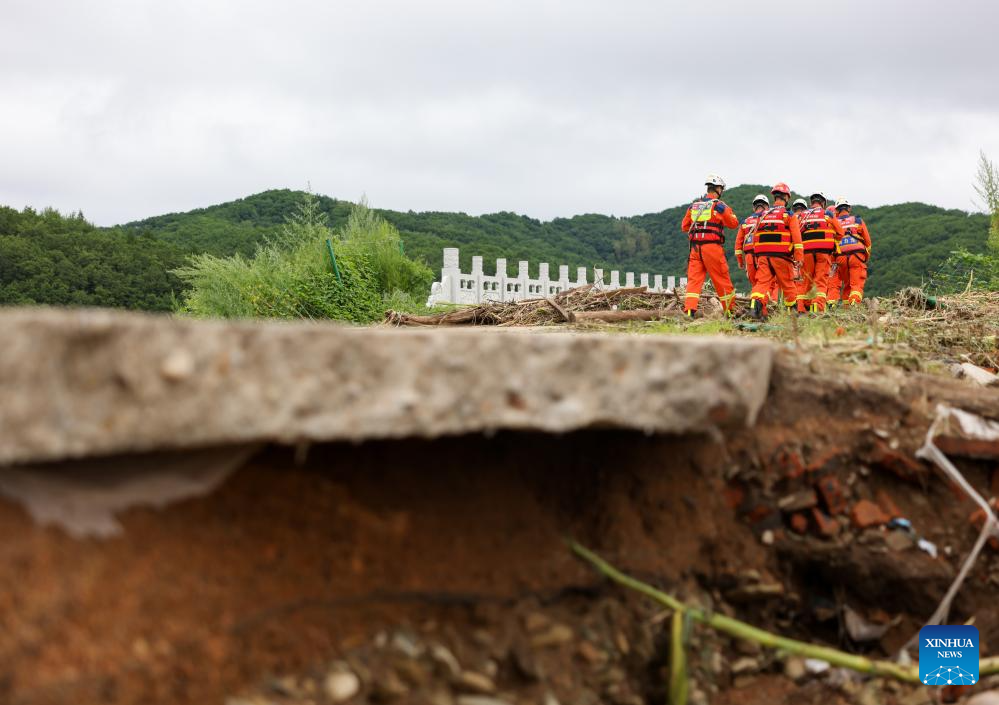 Rescuers walk on a collapsed bridge in Kaiyuan Town of Shulan City, northeast China's Jilin Province, Aug. 6, 2023. (Xinhua/Yan Linyun)