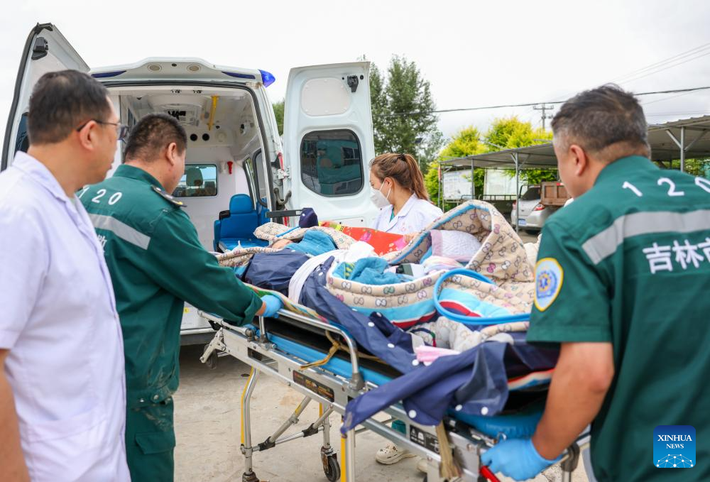 Qu Fengxia is transferred to a hospital in Shulan City, northeast China's Jilin Province, Aug. 6, 2023. (Xinhua/Yan Linyun)